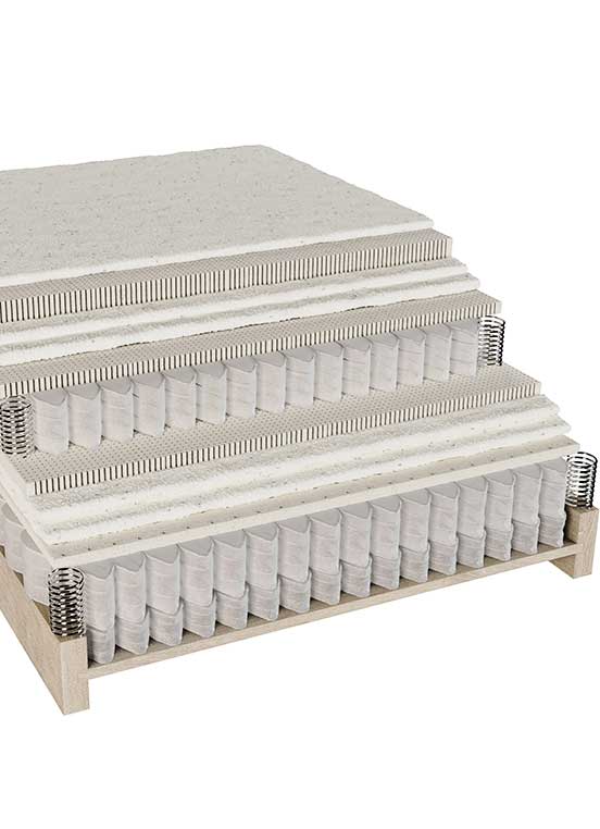 To provide optimal body support, the bed is made up of 22 layers of stuffing material, including wool, cotton, natural Vita Talalay® latex, and pocket springs together with corner springs.